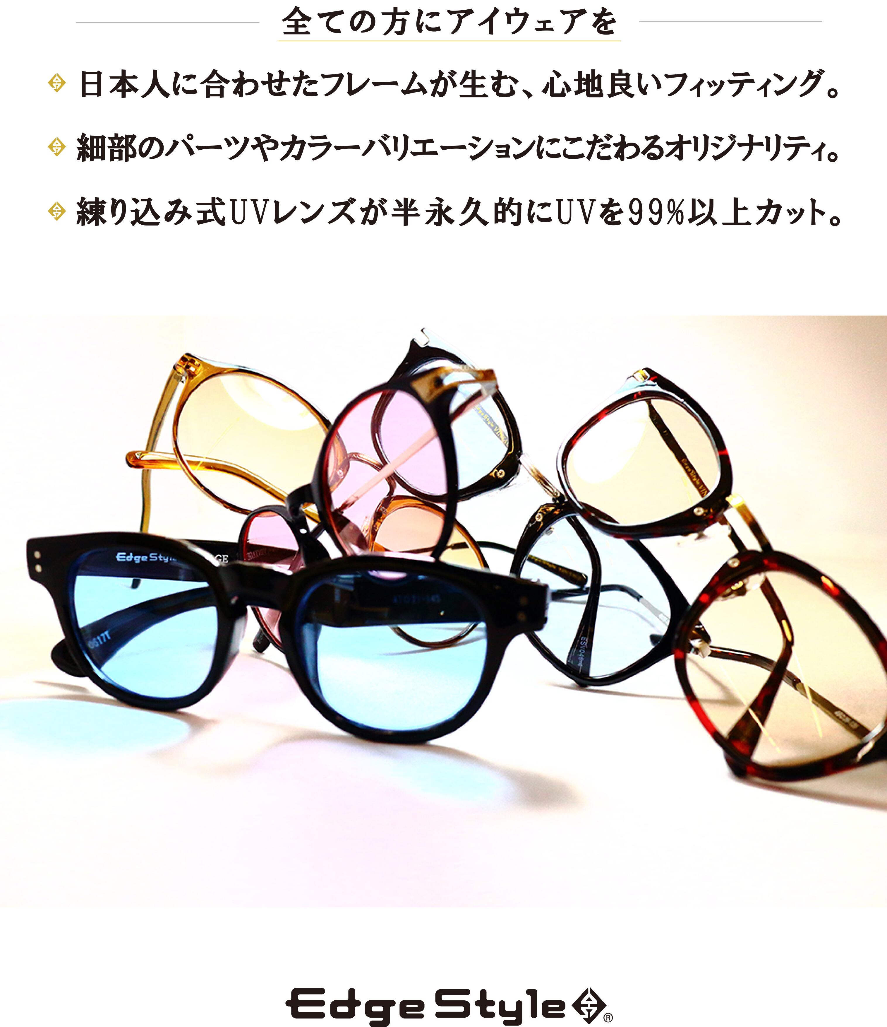 紫外線から目を守るという本来の役割を担うレンズの品質に加え、日本人に合わせた良質なフィッテイング、テンプルとレンズの干渉を防ぐストッパーヒンジ設計など、細部にわたる品質の追及に目を向けています。テンプル内側のみの柄や内外異なったカラーリングを施したEYEWEARはEDGESTYLEの大きな特徴として認知されています。